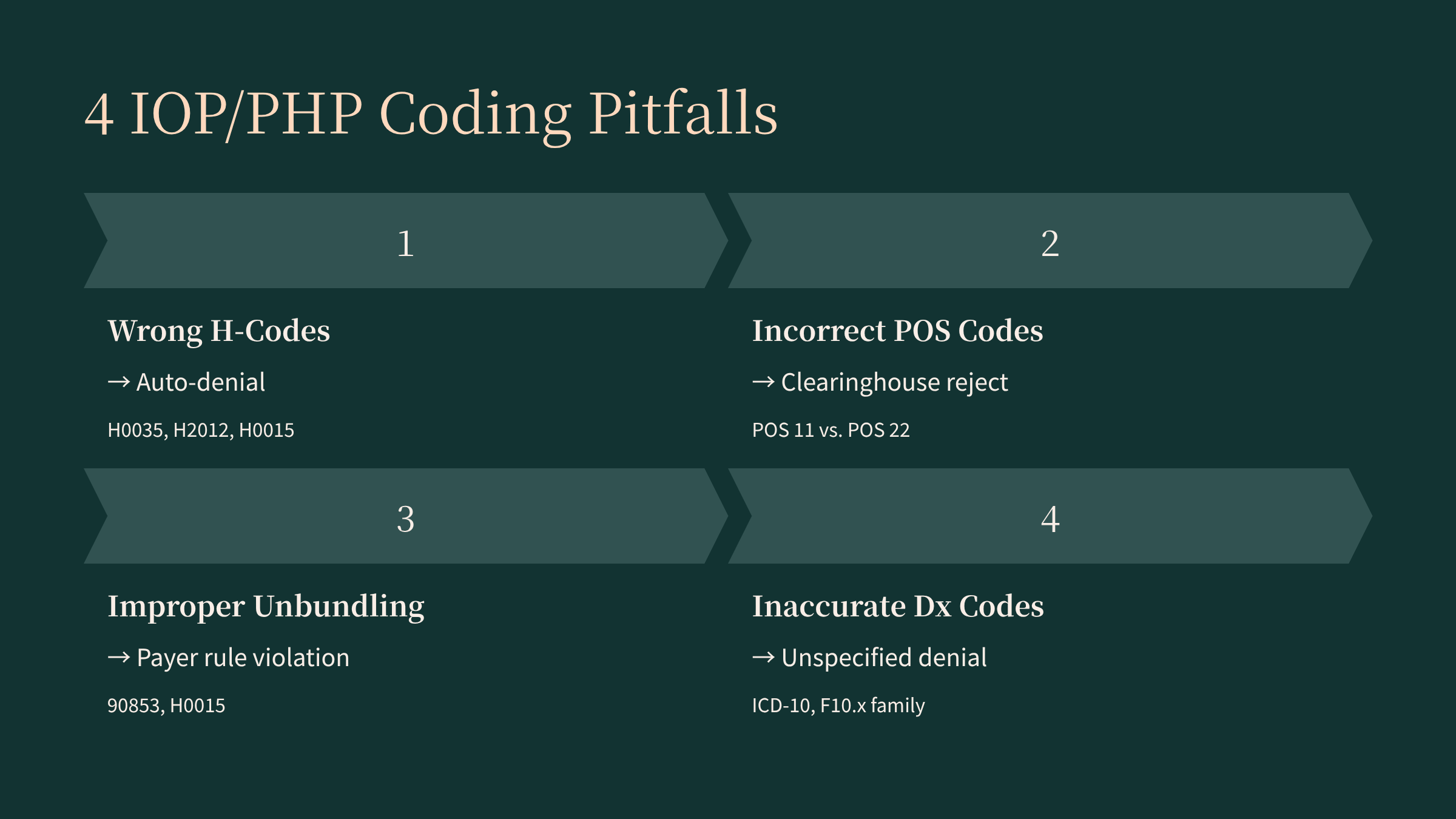 Using the wrong H-codes. Many commercial behavioral health contracts use HCPCS H-codes such as H0035 or H2012/H2014 for certain partial hospitalization or intensive services, and H0015 for intensive outpatient treatment; exact mapping varies by payer policy and contract. If you bill a code that doesn’t match the documented service or the plan’s benefit design, automated edits will often deny the claim before a person ever looks at it.[experian]