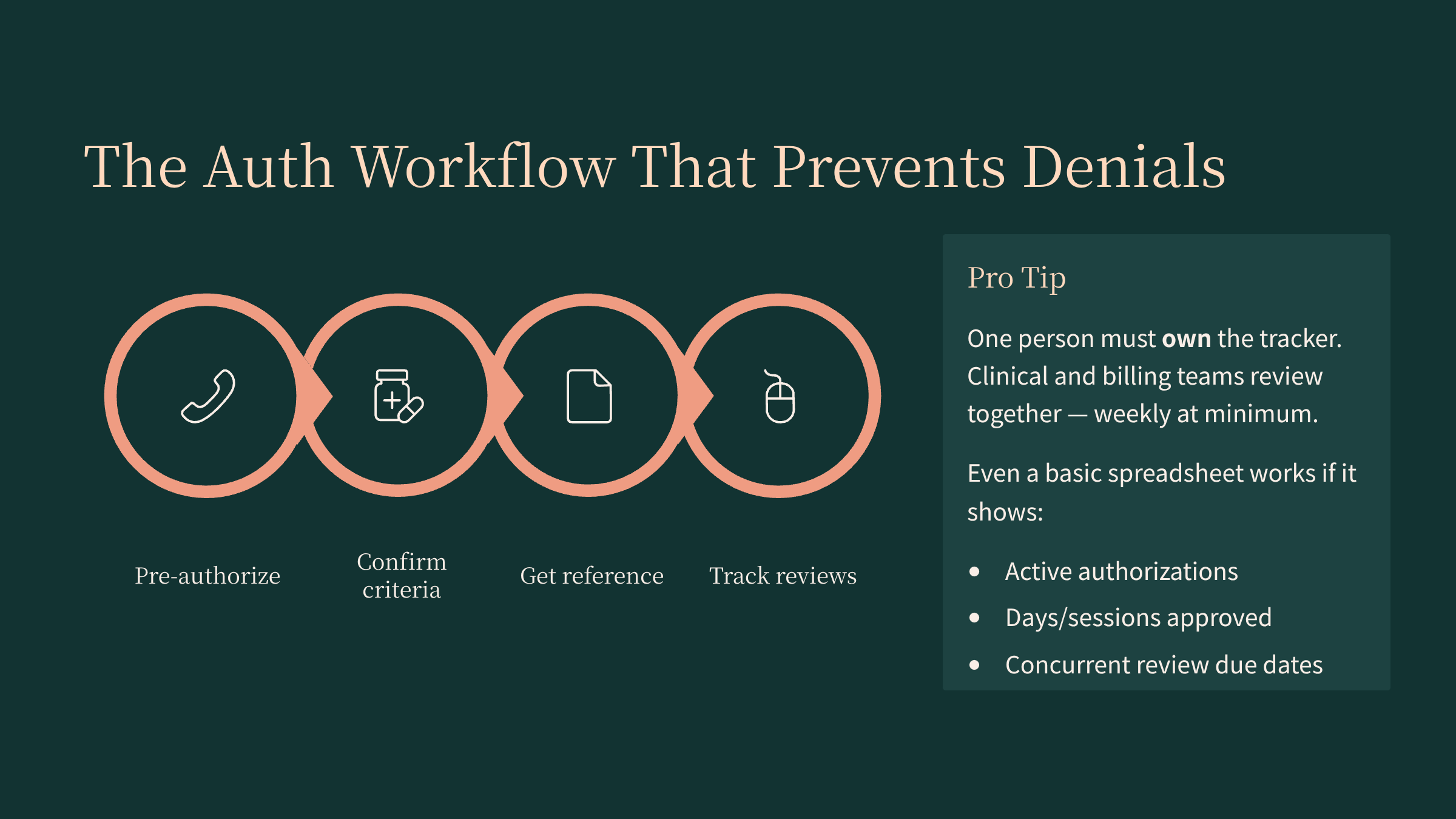 A simple but powerful fix is a shared tracker that shows every active authorization, the number of days/sessions approved, and the concurrent review due date. Even a basic spreadsheet works as long as one person “owns” it and clinical and billing teams review it together regularly.