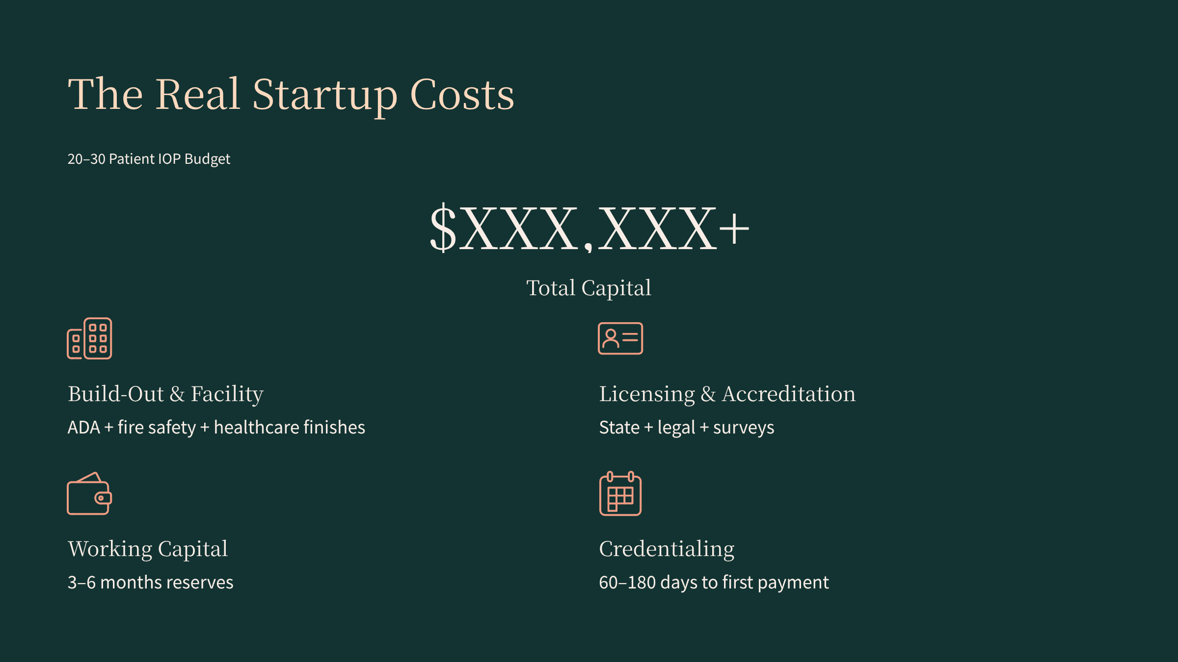 For a 20–30 patient IOP, many founders end up in the ballpark of several hundred thousand dollars in total startup and ramp-up capital, with PHP builds tending higher given more intensive staffing and space needs. The exact number depends heavily on your market, lease terms, staffing model, and how conservative you want to be with cash reserves.pmc.ncbi.nlm.nih+1
