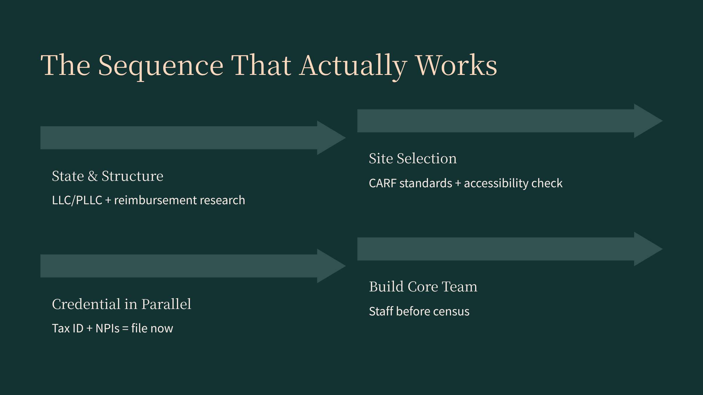 Your clinical background is a genuine competitive advantage. You understand the population, you know what good treatment looks like, and you can build a culture that attracts strong staff — all things that correlate with better engagement and outcomes in outpatient behavioral health.[pmc.ncbi.nlm.nih]