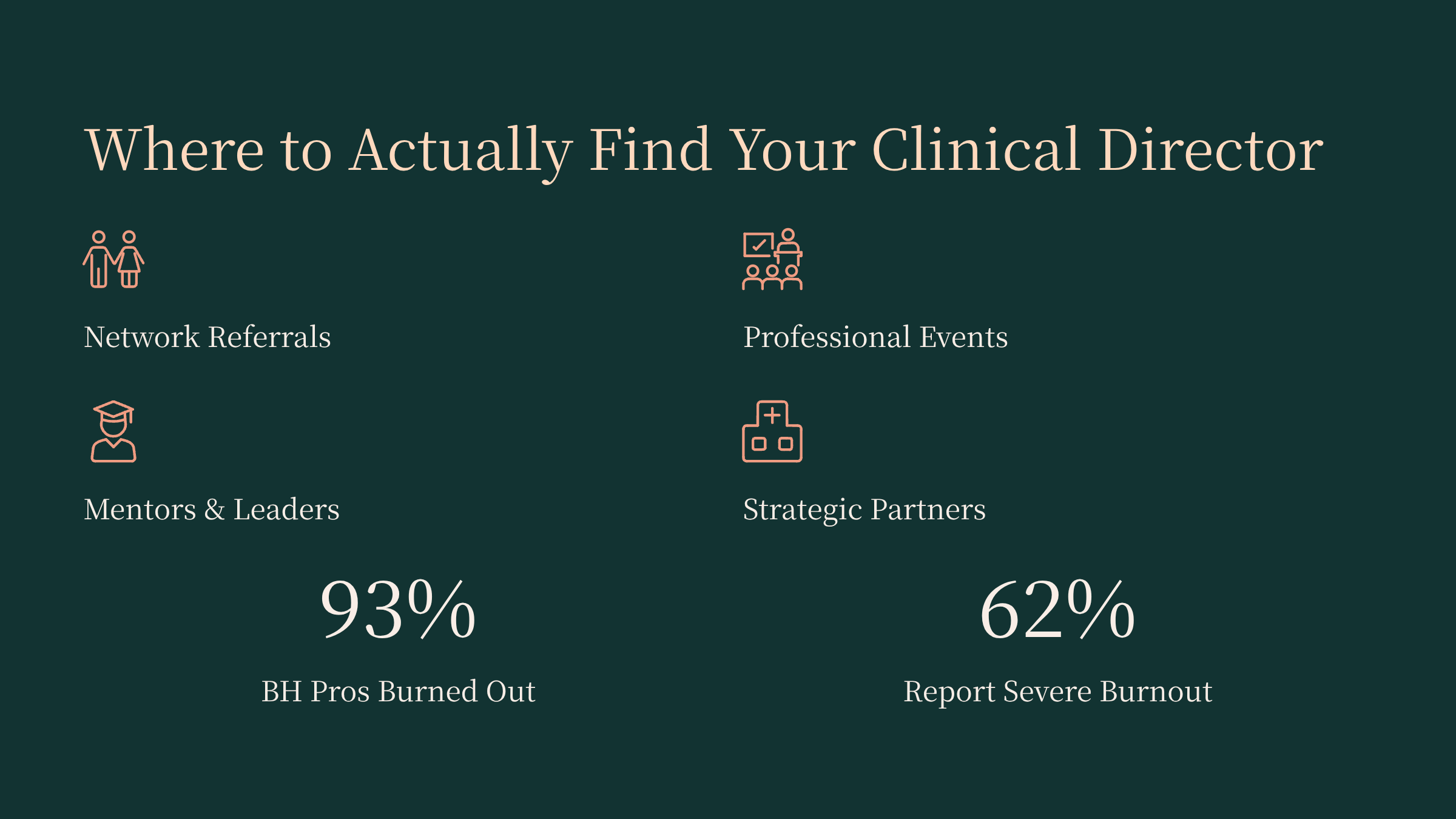 Referral partner networks. Detox centers, sober living operators, and hospital social work departments all know who the strong clinicians in your market are. Ask them who they'd trust to run a program.
