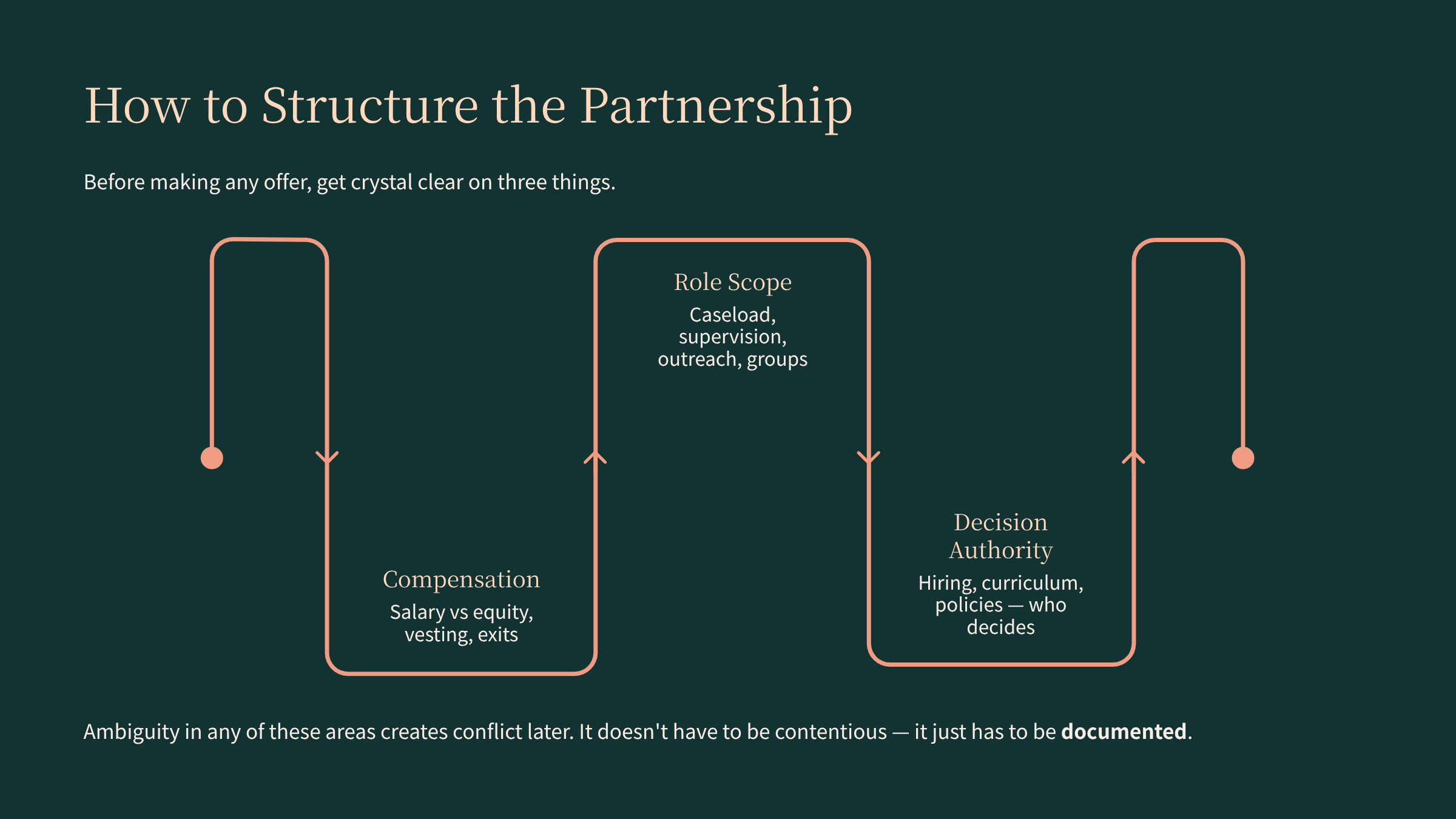 Decision-making authority is the most important conversation nobody has. Who has final say on hiring clinical staff? On program curriculum? On clinical policies? Ambiguity here creates conflict later. It doesn't have to be contentious — it just has to be documented.