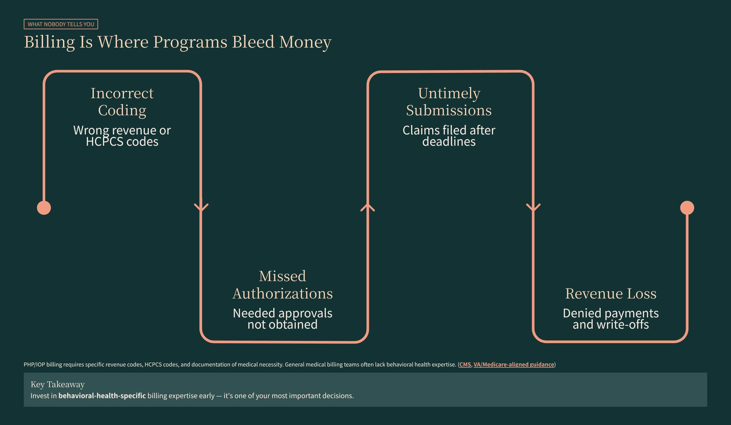 Behavioral health billing is complex, and many general medical billing teams aren’t deeply familiar with PHP/IOP utilization management, condition codes, or per diem bundling policies. VA/Medicare-aligned PHP/IOP billing guidance If you're self-operating, investing in billing expertise that understands behavioral health specifically is one of the most important early decisions you can make.
