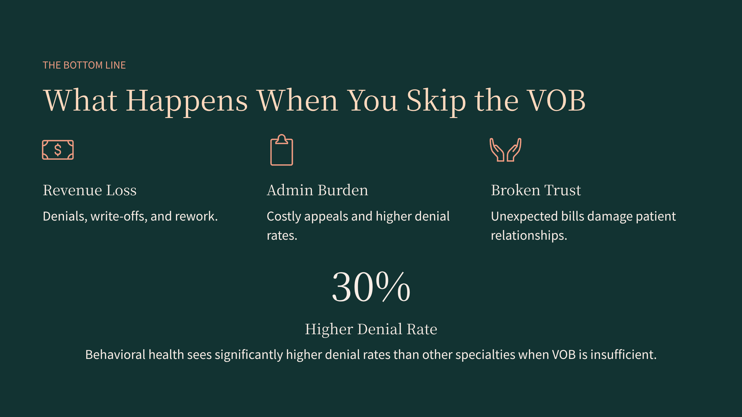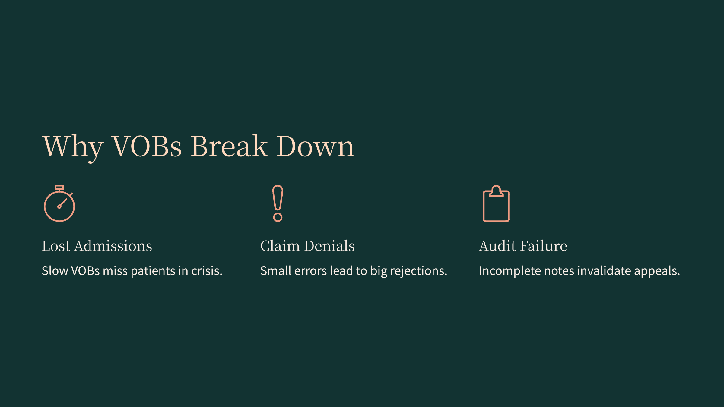 Speed is a real constraint at the admissions stage. Patients in crisis are often unwilling or unable to wait days while your team plays phone tag with insurance companies, and delays in eligibility and benefit verification are a known driver of lost or delayed revenue in medical practices generally. If your VOB process is slow, you're likely losing admissions to providers who can move faster. cms.officeally