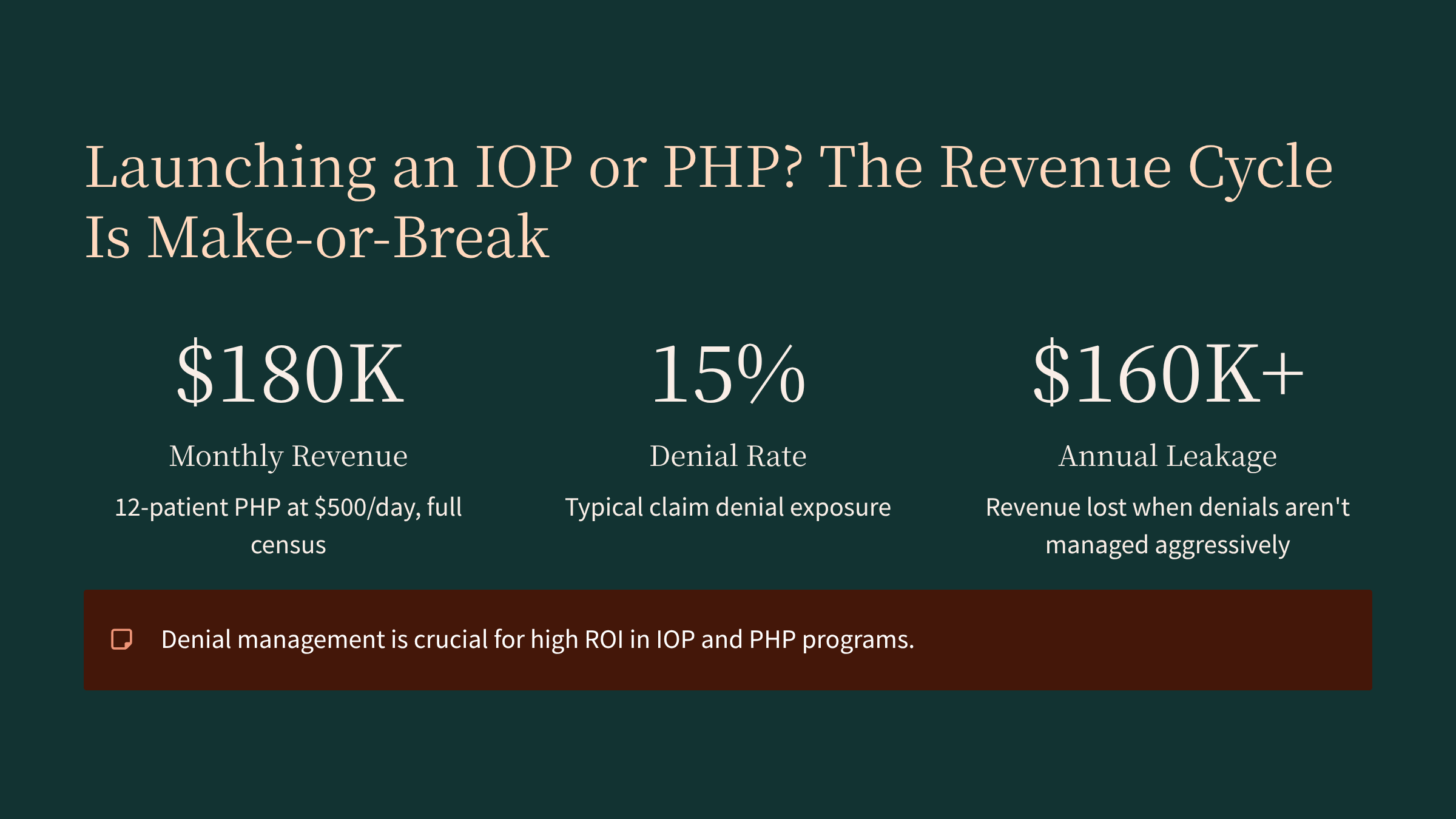 Denial management isn't glamorous. It requires consistent follow‑up, documentation discipline, payer relationship management, and people who understand both the clinical and administrative sides of the claim. But for many behavioral health providers, especially those running IOP and PHP programs, it’s one of the highest‑ROI operational investments they can make.[blog.coresolutionsinc]