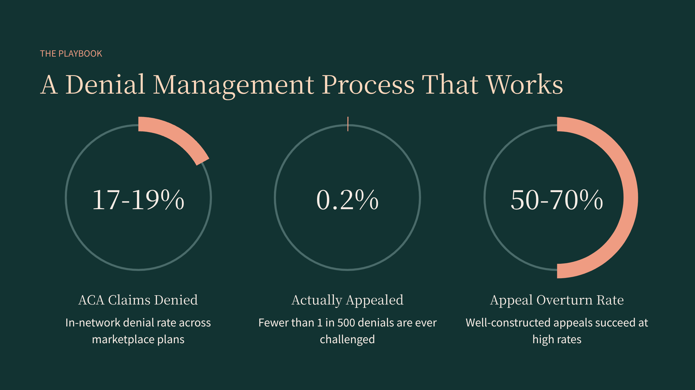 The practices that keep denial rates in a healthy range do a few things consistently. National data show that across ACA marketplace plans, about 17–19% of in‑network claims are denied, and fewer than 0.2% of those denials are ever appealed, which means organizations that actively manage denials immediately separate themselves from the pack.counterforcehealth+1