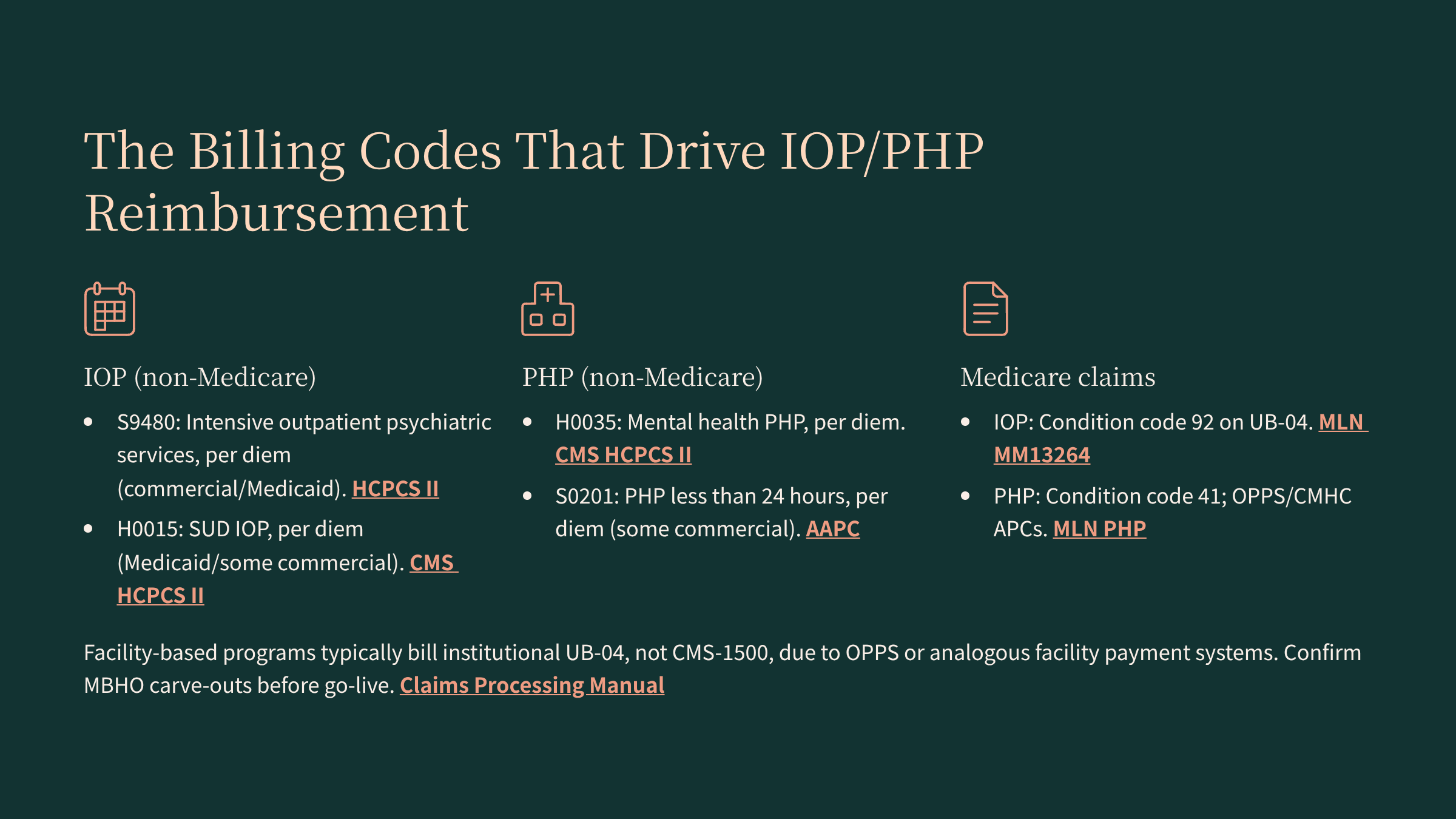 Most clinicians researching IOP/PHP programs want to know one thing before anything else: what’s the actual revenue per patient per day. It’s a fair question, and the answer is frustratingly inconsistent across the industry. Reimbursement rates for intensive outpatient programs and partial hospitalization programs vary dramatically depending on the payer, the state, the billing codes used, and whether you’re in-network or out-of-network. But there are real ranges and policy anchors you can work with when building a financial model. Here’s what the numbers and rules actually look like, with links you can take straight to the source.