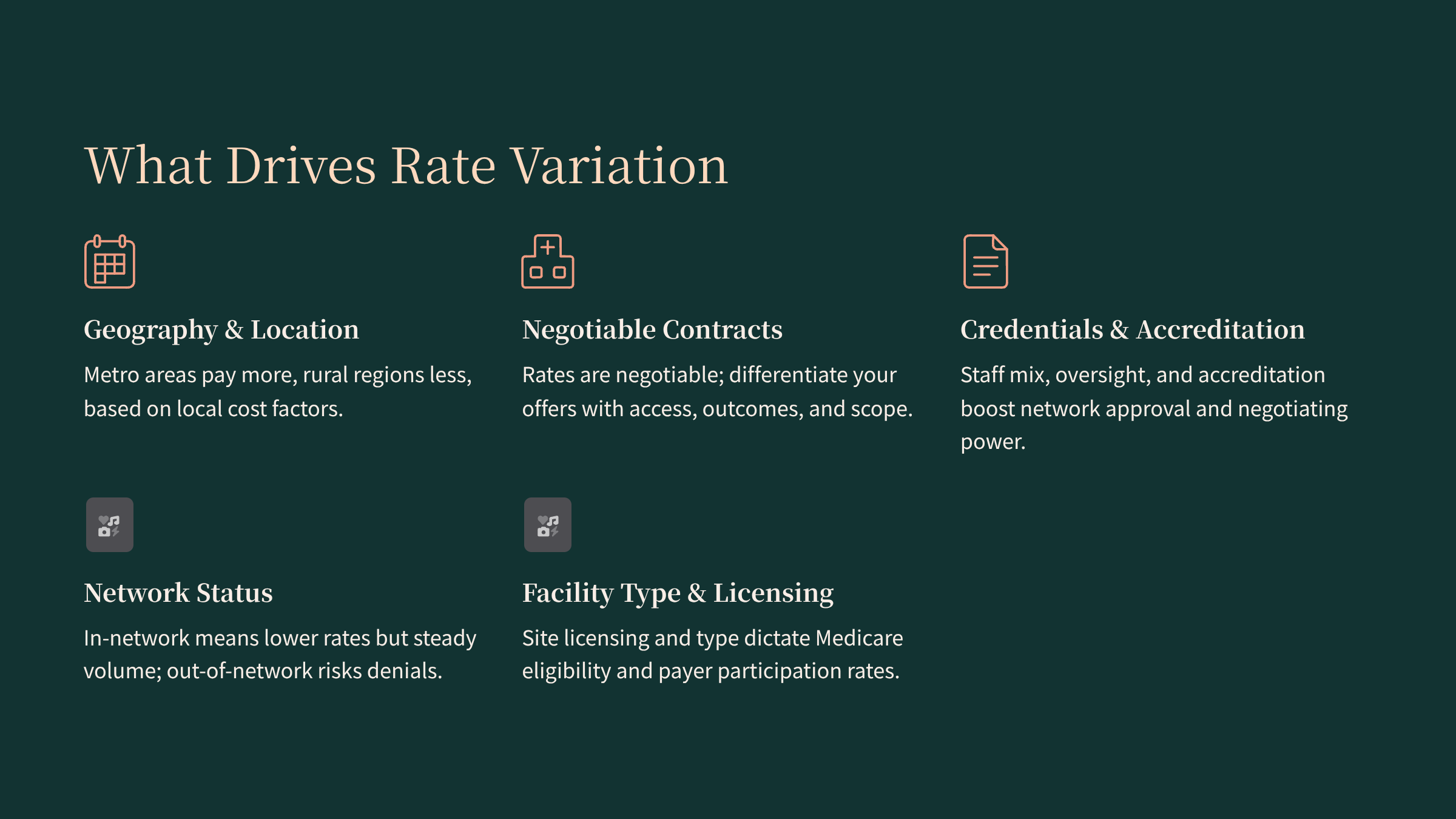 Your payer contract is negotiable. For commercial and Medicaid managed care, the first rate in a contract proposal is rarely the only option; plans will sometimes move when you bring strong clinical quality, outcomes data, or unique access (e.g., limited local alternatives or specialty programming). This is based on payer contracting experience rather than a formal rule, but it’s a real‑world pattern across markets.