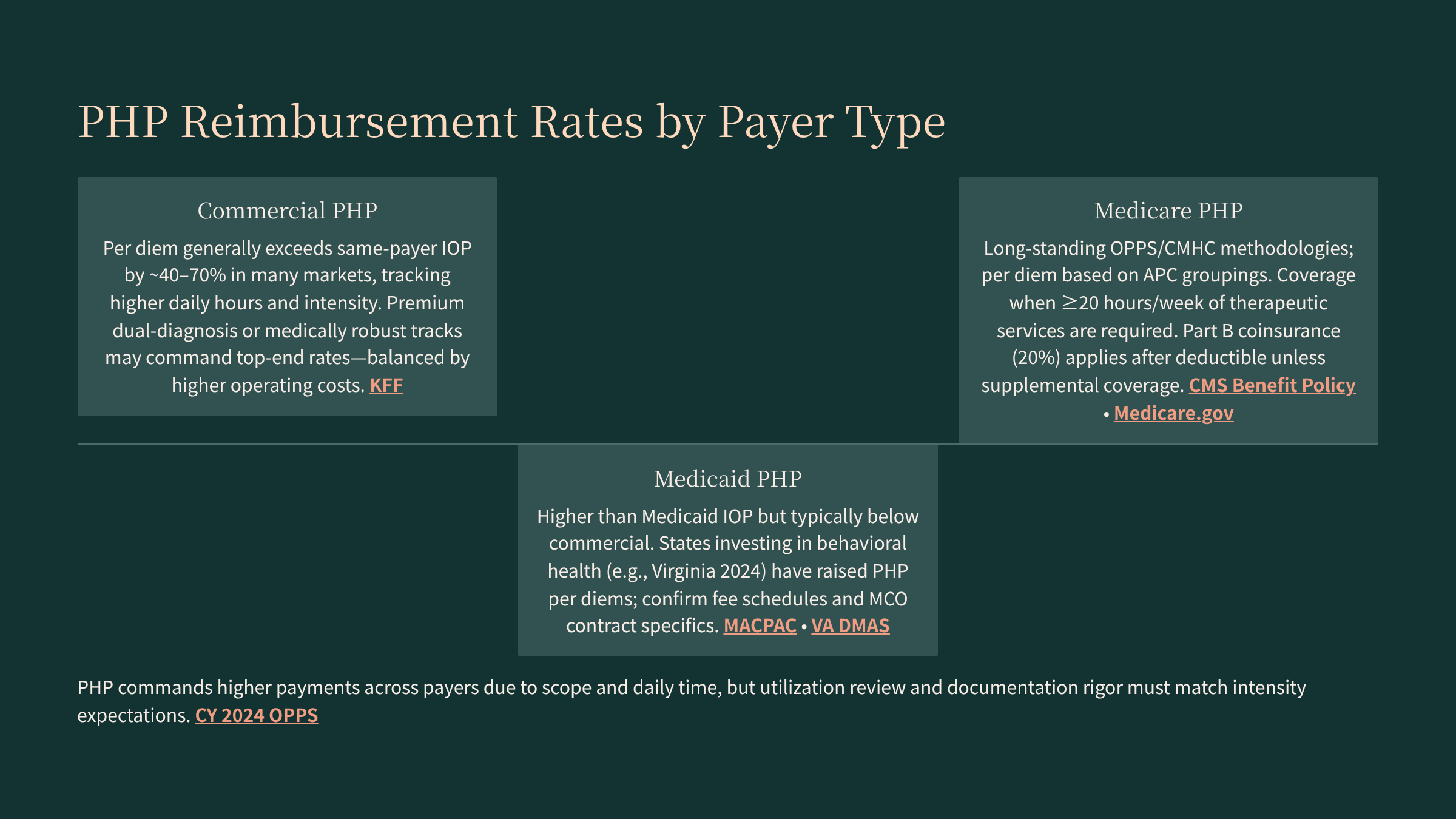PHP per diem reimbursement is generally higher than IOP from the same payer, because PHP requires a minimum of 20 hours of services per week and offers a more intensive level of care. CMS Manual System – Medicare Benefit Policy, Pub. 100‑02