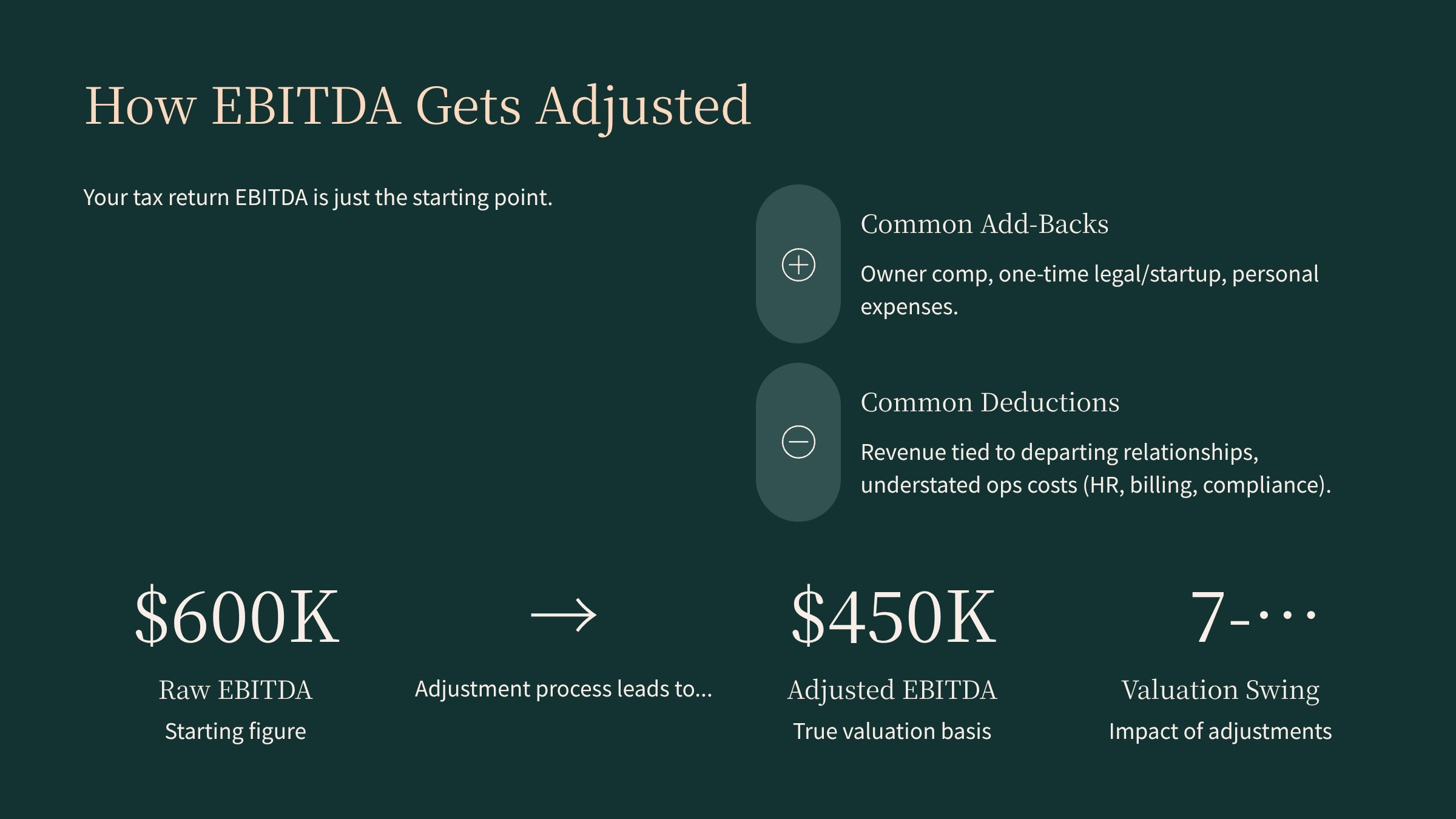 The adjusted EBITDA is what the multiple actually gets applied to. So if your raw EBITDA is $600K but adjustments drop it to $450K, you’re getting a multiple on $450K — not $600K — and that math can move your valuation by seven figures.