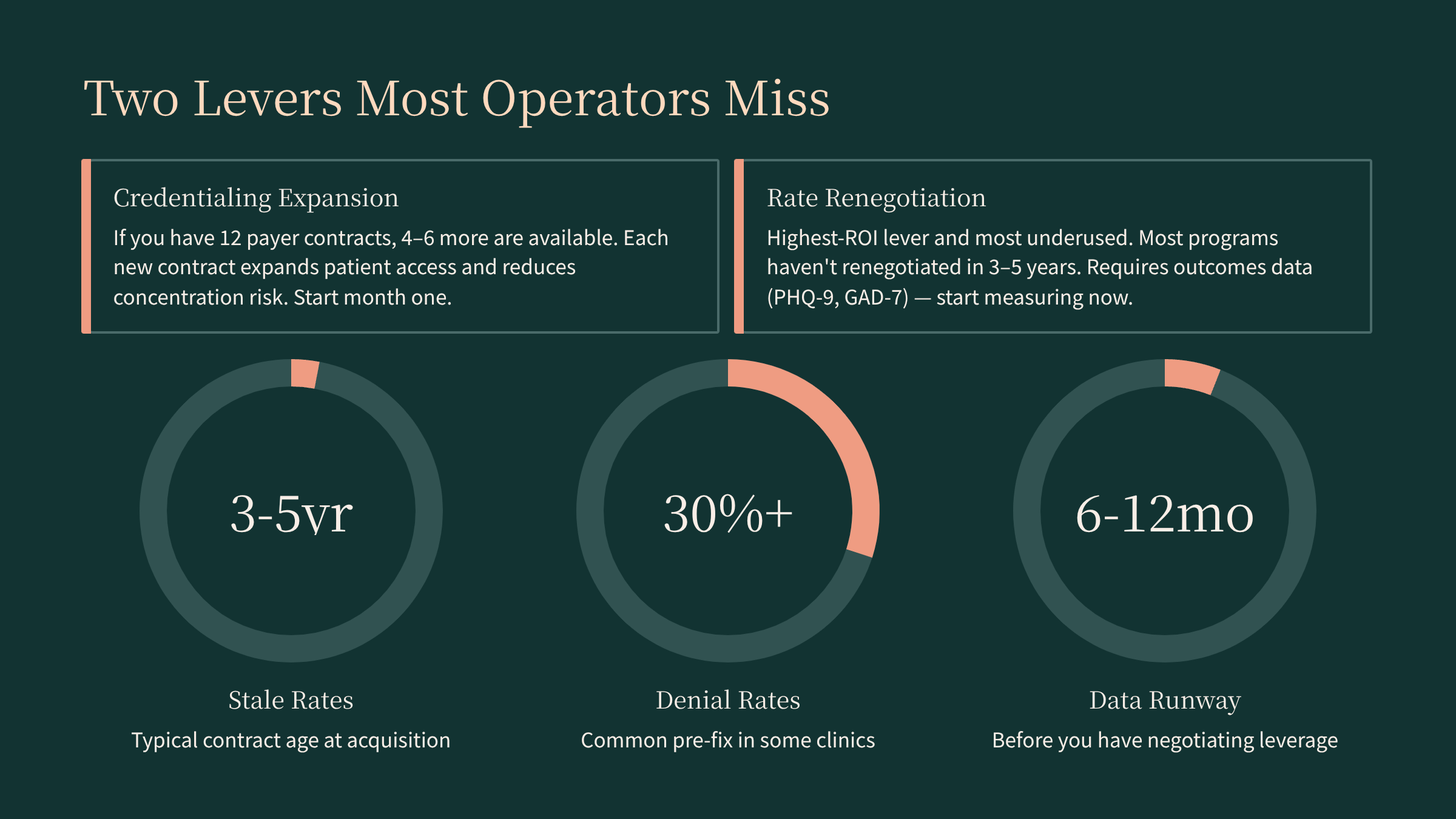 Commercial rate renegotiation is consistently the highest-ROI lever in behavioral health and the most underused. Most acquired programs have been operating on the same contracted rates for 3-5 years. Negotiations can yield increases, especially with solid outcomes data like PHQ-9 or GAD-7 scores.[bhbusiness]
