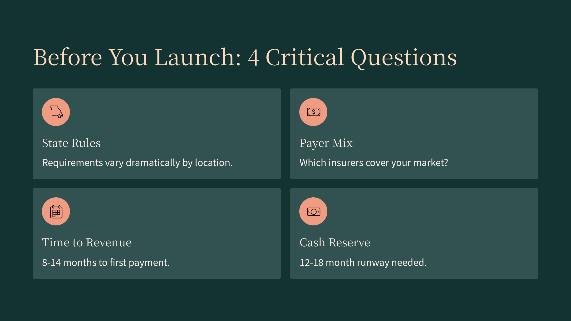 Before comparing models, you need to understand what goes into getting a program from idea to first patient. It’s not just hanging a shingle.