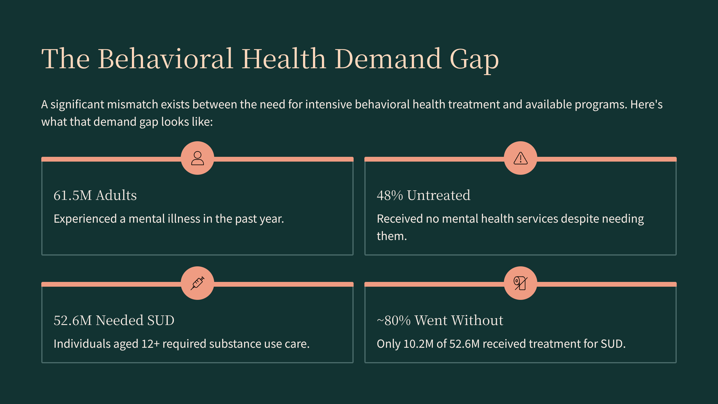 In 2024, an estimated 61.5 million adults had any mental illness, and about 48% did not receive mental health treatment in the past year.(SAMHSA) Around 52.6 million people 12+ were estimated to need substance use treatment, but only about 10.2 million received it, leaving a large group who often lack access to the intermediate level of care between weekly therapy and inpatient hospitalization.(NACo / SAMHSA)