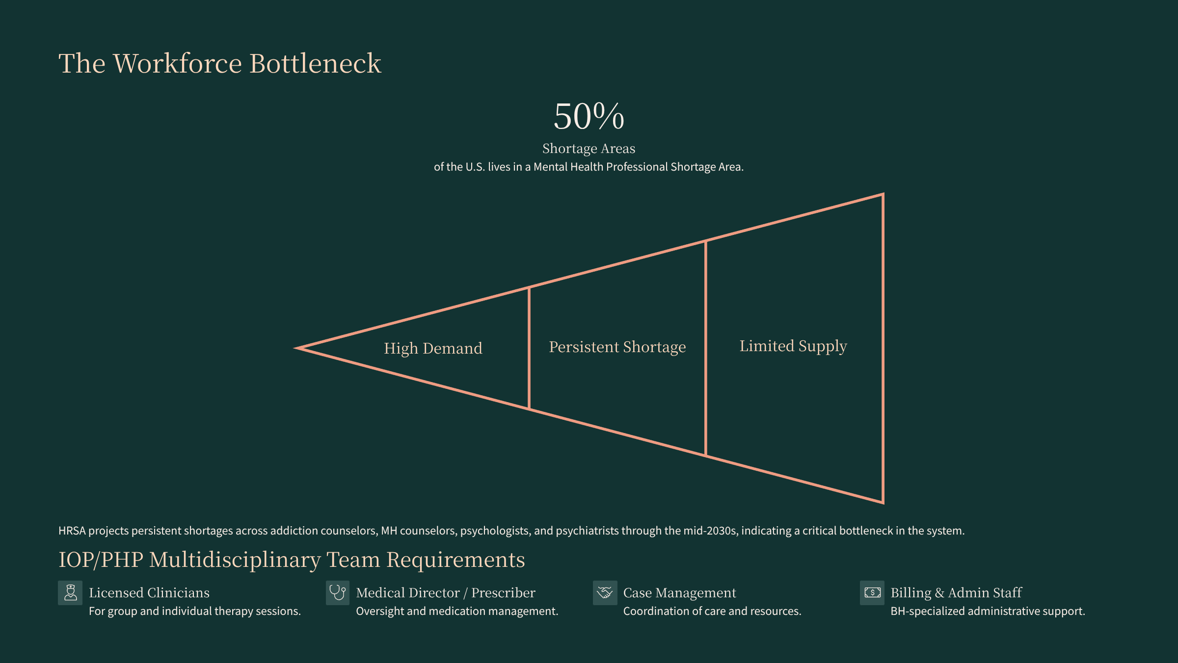 We have tens of millions of adults with mental illness, tens of millions more who need substance use treatment, and a system that still reaches only a portion of them — especially at the intermediate levels of care where IOP and PHP live.(SAMHSA)[(NACo / SAMHSA)] Workforce shortages are projected to persist through at least the mid-2030s, and policymakers and payers are explicitly trying to steer more care into intensive outpatient and partial hospitalization models.(HRSA)[(CMS)]