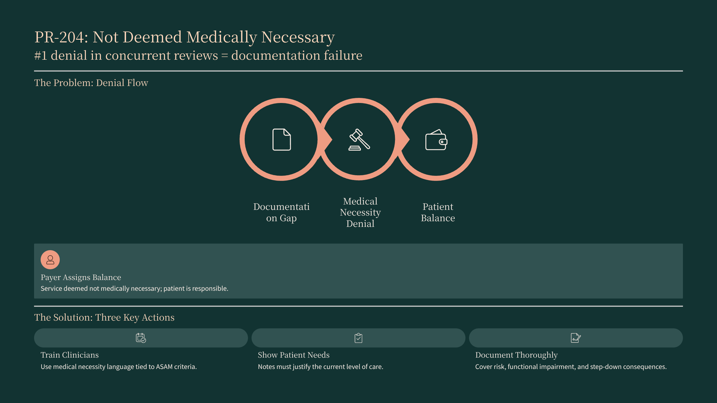 The three highest‑leverage actions are: (1) verify benefits and authorization requirements before every admission, including specific codes you plan to bill; (2) train clinical staff on medical necessity documentation linked to recognized criteria like ASAM or level‑of‑care guidelines; and (3) build a denial tracking log reviewed weekly to catch payer‑ and code‑specific patterns early.pmc.ncbi.nlm.nih+1