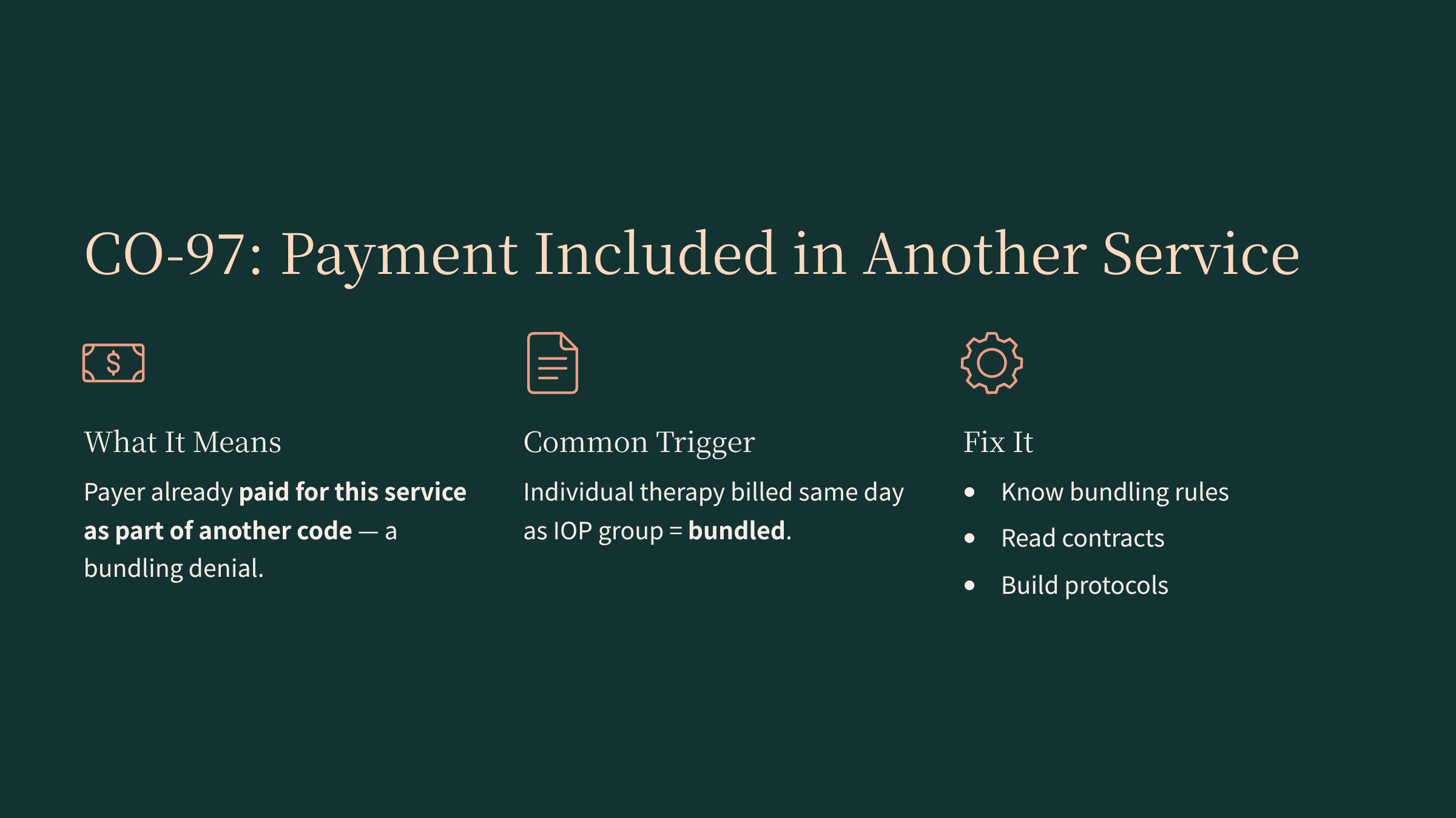 CO-97 is one of the more frustrating denials because it's often the result of bundling rules — the payer is saying they already paid for this service as part of another code. In behavioral health, this happens frequently when programs bill individual therapy on the same day as an IOP group bundle or per‑diem code, and the payer considers the individual session included in that rate.experian+1