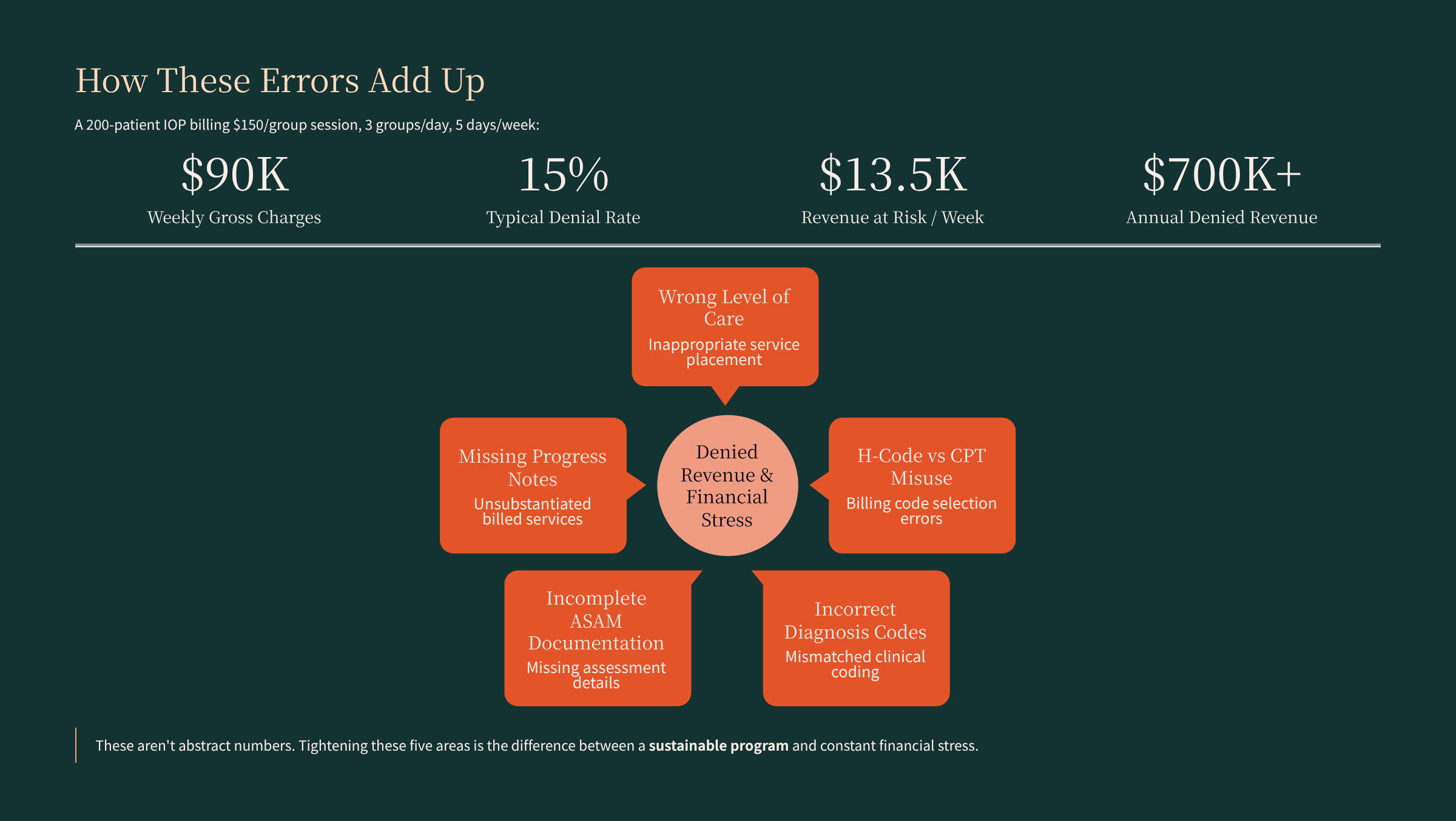 Let’s make the math real. Imagine a 200‑patient IOP program billing an average of $150 per group session, running three groups per day, five days per week. That’s roughly $90,000 per week in gross charges (200 patients × 3 groups/week × $150). A denial rate of 15% — which is not unusual for behavioral health programs with weak billing infrastructure and documentation — means about $13,500 per week in revenue at risk. Over a full year of operations, that’s more than $700,000 in denied or delayed reimbursement.[blog.coresolutionsinc]