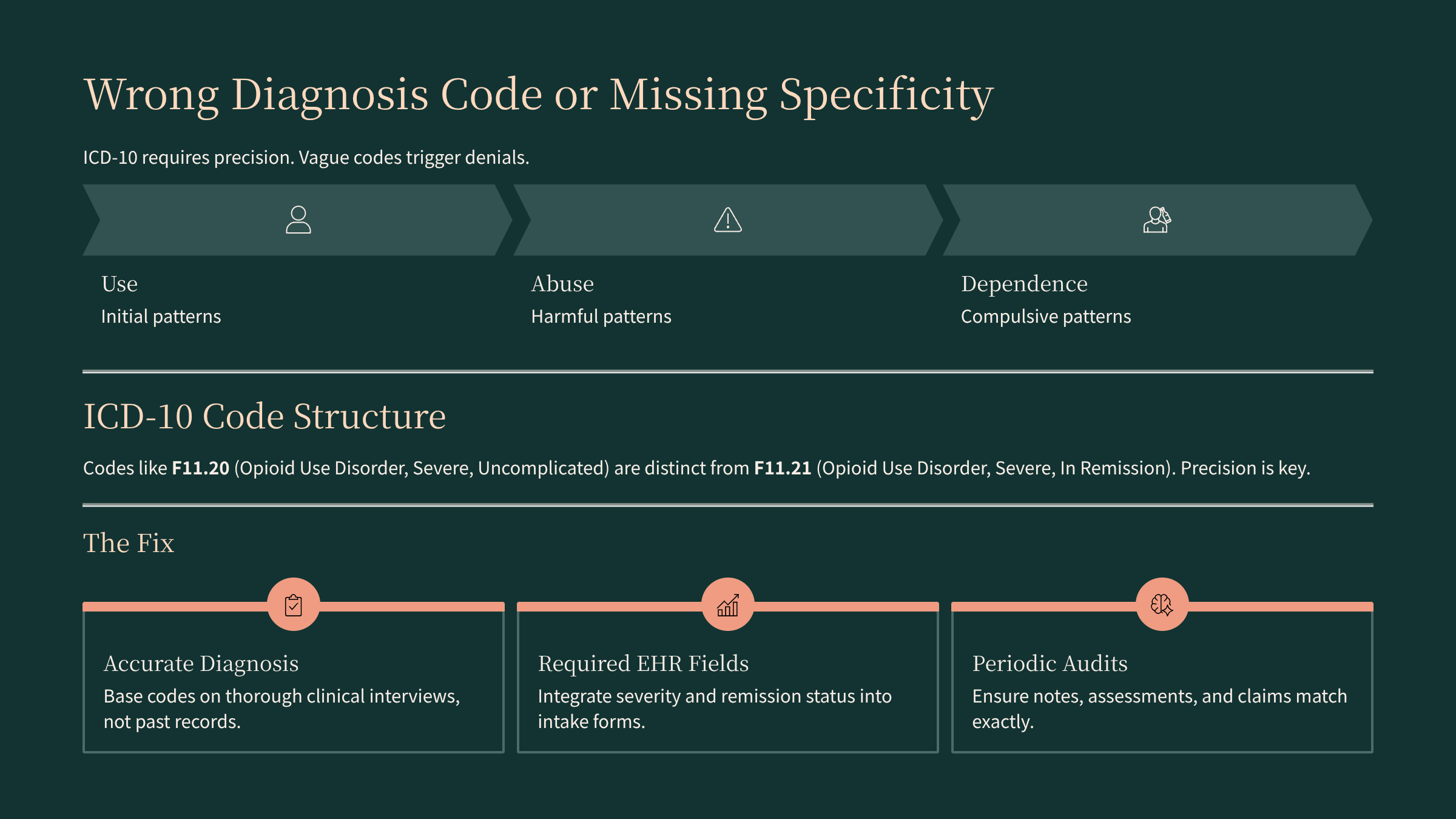 The fix: Every diagnosis code on a claim should come directly from a completed clinical assessment or diagnostic interview — not from memory or copy‑forward. Build required fields into your intake documentation for severity specifiers, remission status, and polysubstance use so that clinicians must select the appropriate ICD-10 details before a chart can be closed. Periodically audit charts to make sure the diagnosis in the note, the ASAM assessment, and the code on the claim all match.
