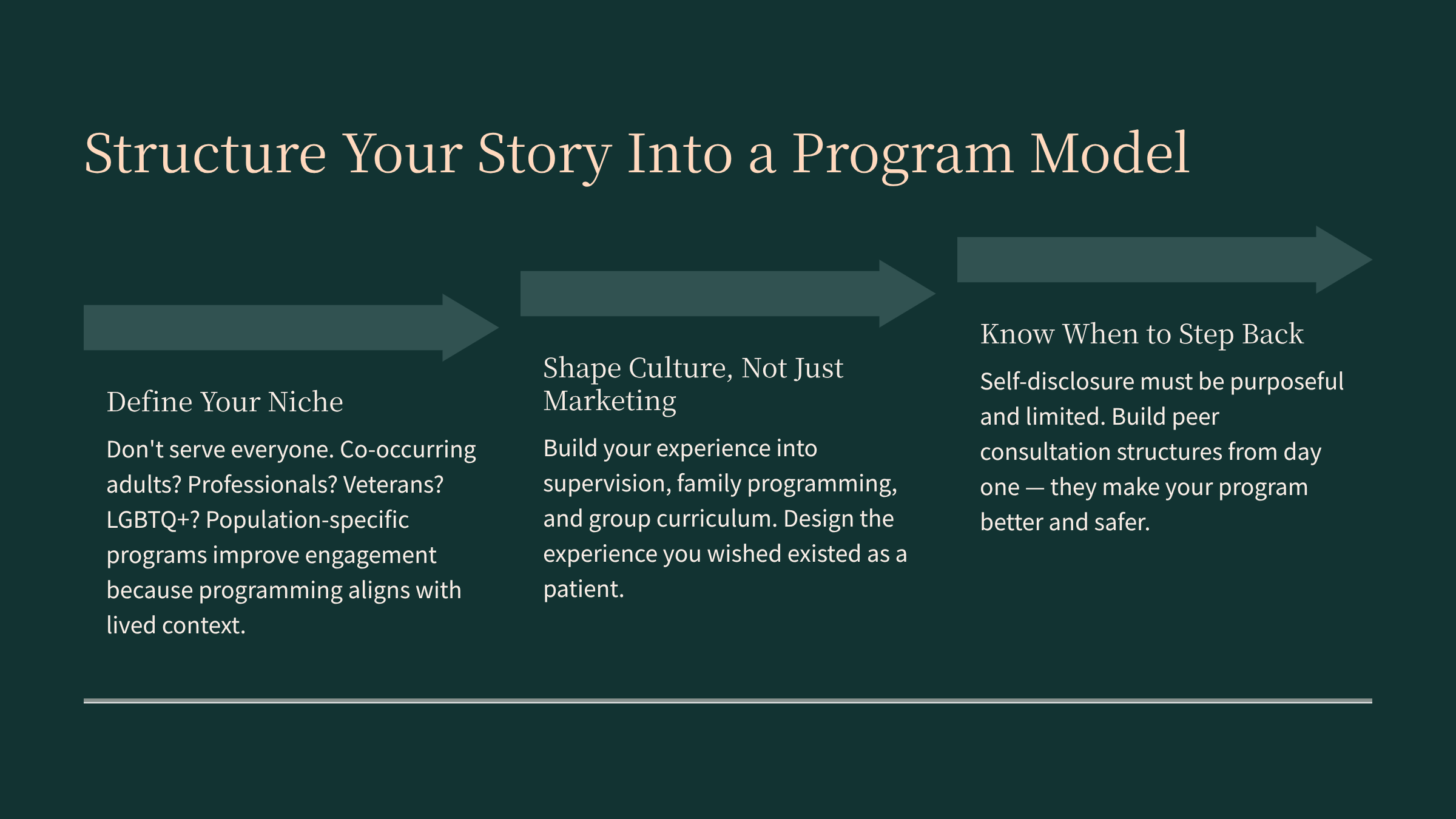 This one is hard for clinicians with lived experience: there are moments when your personal story can blur the clinical relationship. Good supervision and peer consultation structures protect against this. Clinical guidance on self-disclosure emphasizes that it should be purposeful, limited, and in the client’s best interest—not to meet the clinician’s emotional needs. Build supervision and consultation in from the start—not as compliance requirements, but because they make your program better and safer for both clients and staff.[manuals.health]