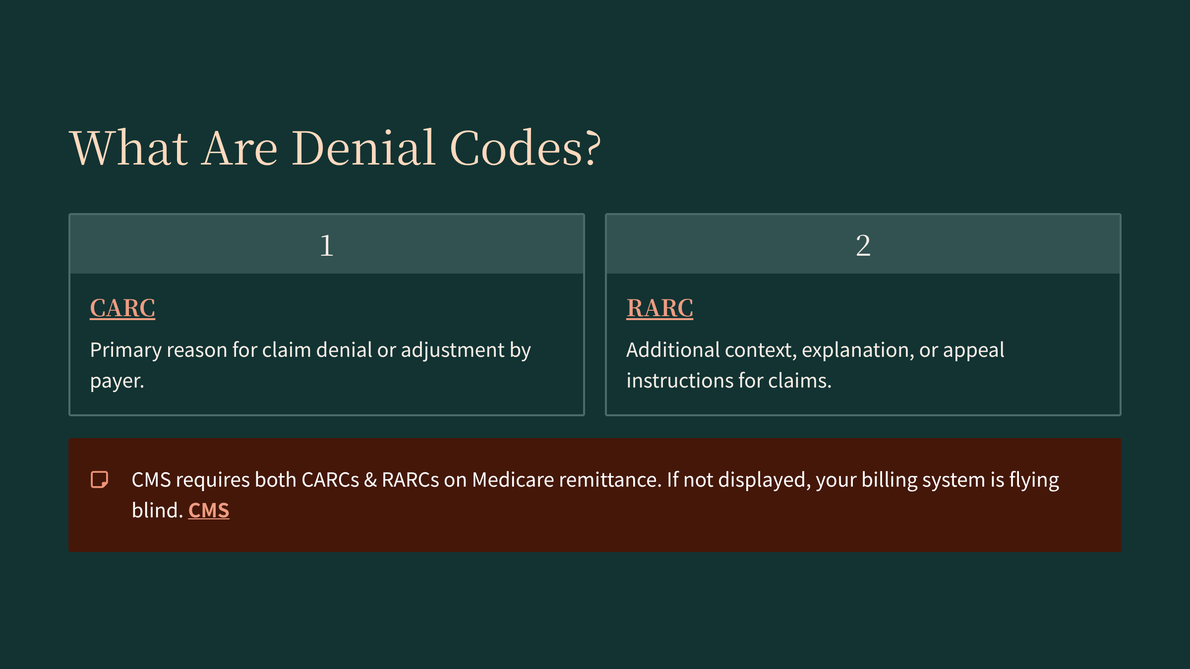 CARC codes explain what adjustment or denial occurred on a claim (for example, non-covered service or duplicate claim). RARC codes provide additional context or instructions—such as what information is missing or what documentation is needed—so you can decide whether and how to correct or appeal. CMS X12
