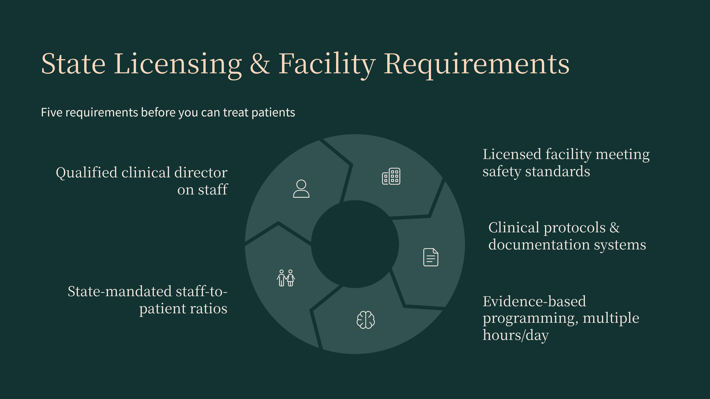 Personal qualifications of your leadership team – Owners do not usually need clinical licenses, but your clinical director and medical leadership do need the right independent credentials.