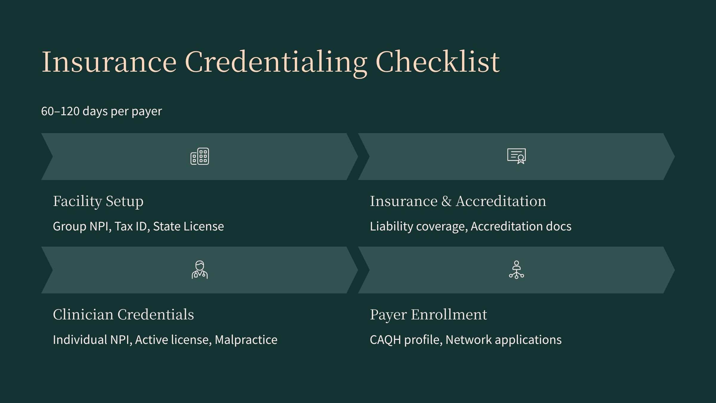 State facility licensure can range from a few months to longer depending on your state’s review timelines, survey schedules, and whether you need to complete accreditation first. Insurance credentialing and contracting often adds another 60–120 days per payer, so many operators plan on several months of ramp-up before they can bill across all targeted health plans.jointcommission+1