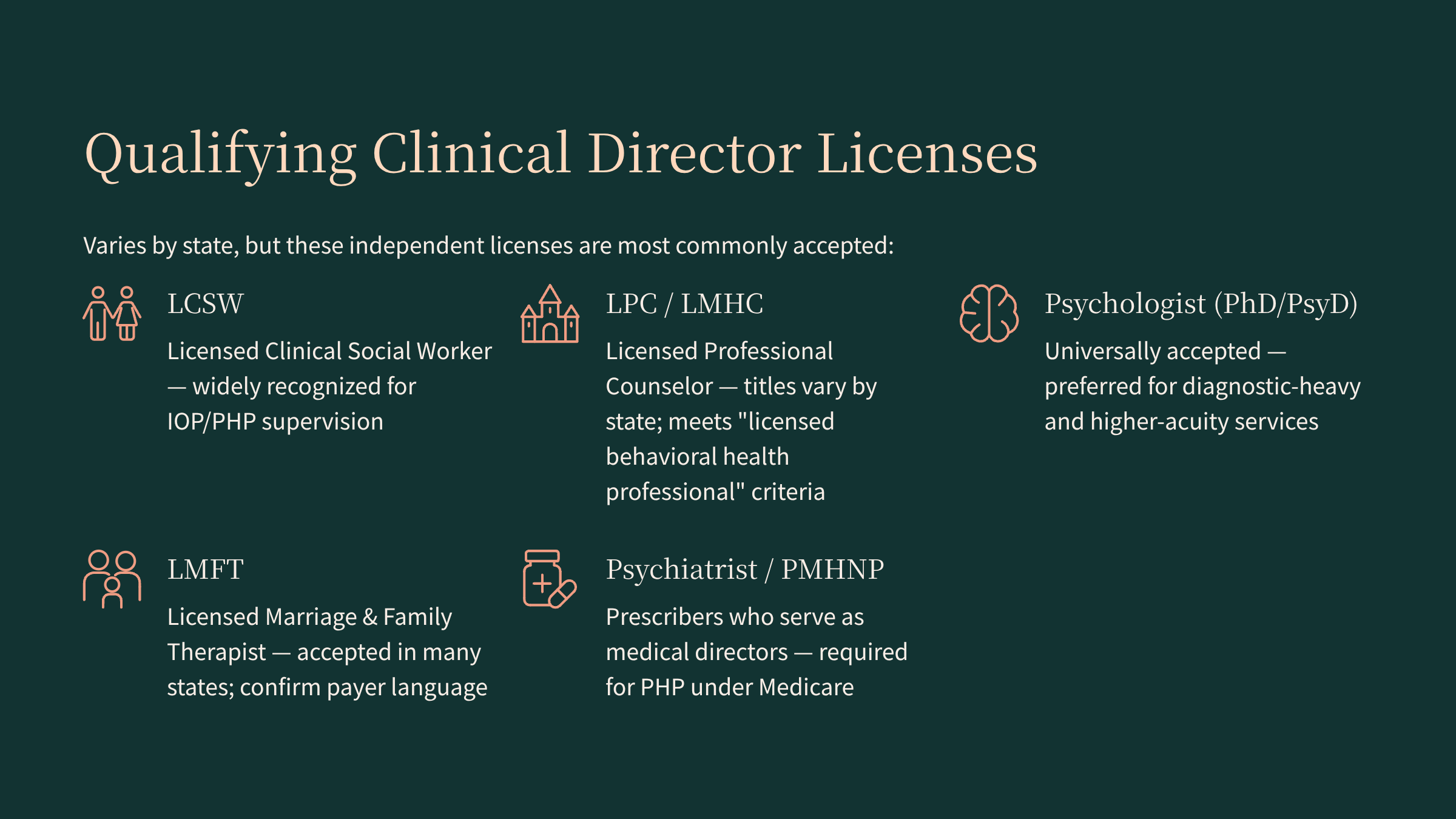 First, separate two roles in your head: the business owner and the clinical director. In most states, the person who owns the IOP/PHP center does not need to hold a clinical license; what matters to regulators is that the licensed entity and clinical leaders meet state rules, not that the equity owner is a clinician. You could be an MBA, a former patient turned entrepreneur, or a licensed clinician who wants to wear both hats.[oklahoma]
